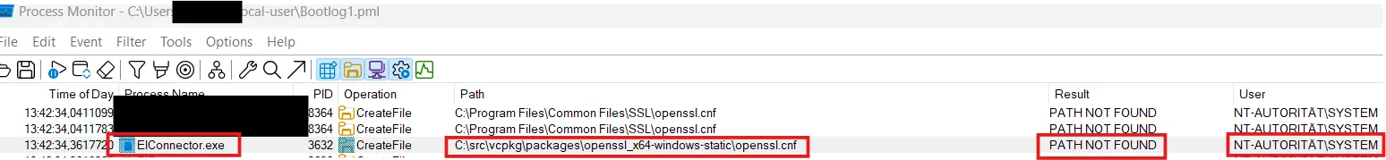 In this particular case, we were investigating a vulnerability write-up about ESET Inspect Connector (CVE-2025-13176). One of the screenshots from this report is a Process Monitor log that shows the attempt of a privileged process to load an openssl.cnf file from a path that an unprivileged can influence.
