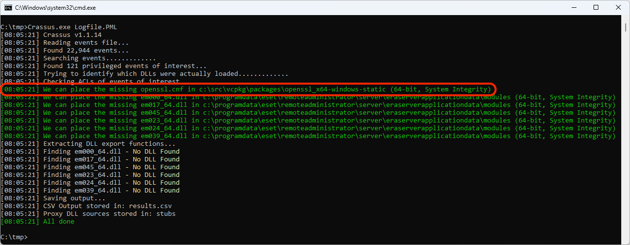The openssl.cnf LPE primitive is common enough on the Windows platform, so I explicitly added it to the Crassus LPE-finding tool. So obviously, we were curious to see if this vulnerability could indeed have been just one of the many Crassus findings. After installing the vulnerable version of the software, we check the Process Monitor log file with Crassus: