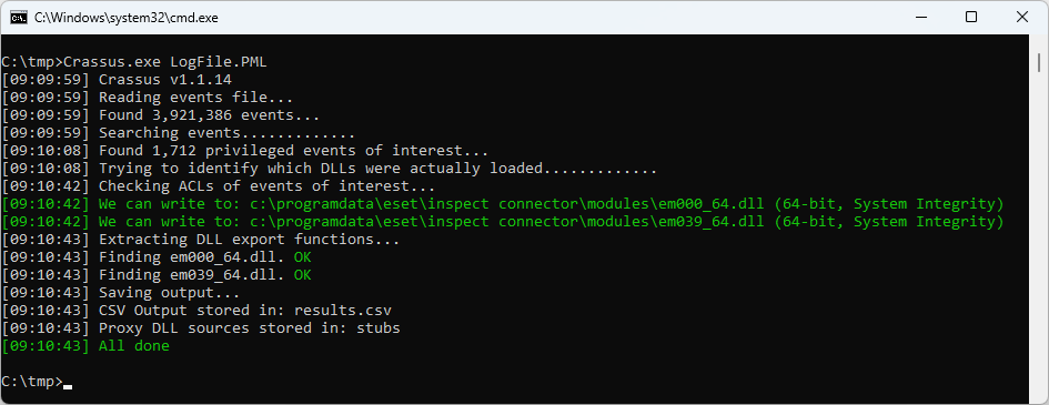 Oh. Yes, Crassus did indeed find CVE-2025-13176 with zero effort whatsoever. However, it found what appears to be additional vulnerabilities in the form of noticing the attempt to load several DLL files in the c:\programdata\eset\inspect connector\modules directory, which can be written to by an unprivileged Windows user. Did perhaps ESET fix this as well without assigning a CVE to it? Time to test the latest version of the ESET Inspect Connector software…